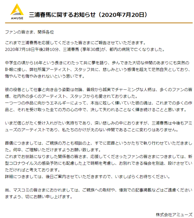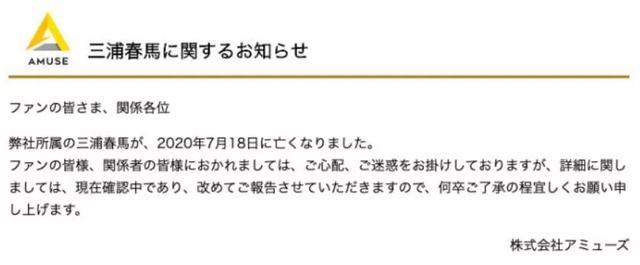 三浦春马尸检完成后 公司发公告 葬礼已经秘密举行