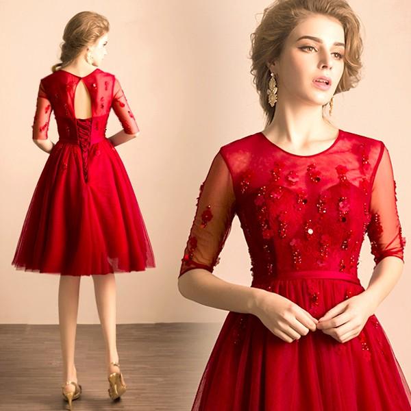 パーティードレス 赤 ミディアム丈ドレス 袖あり ウェディングドレス 結婚式ミディアム丈 大きいサイズ お呼ばれドレス レッド 通販 Lineポイント最大1 0 Get Lineショッピング
