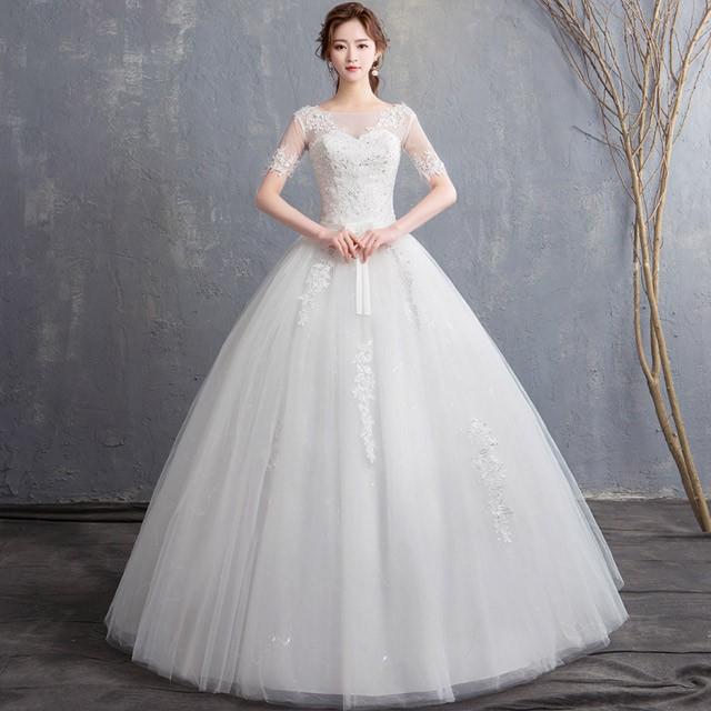 刺繍 レース 五分丈 ロングトレーン aライン ウェディングドレス 白 二次会 花嫁 ウェディングドレス 大きいサイズ 袖あり 海外挙式 Onlythebest オンリーザベスト プチプラドレス 格安韓国ドレス オルチャンドレス専門店 今なら 送料無料 キャンペーン中