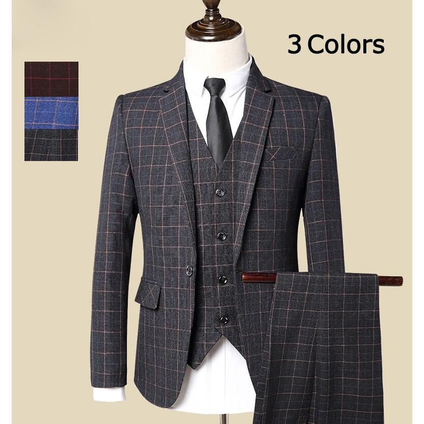 楽天市場 予約販売 送料無料 チェック柄 スリムスーツ スリーピース 3ピース メンズ スーツ セットアップ メンズスーツ 紳士服 カジュアル スーツ ビジネススーツ チェックスーツ チェック柄スーツ ネイビー ブルー パーティー 結婚式 二次会 おしゃれ ギフト